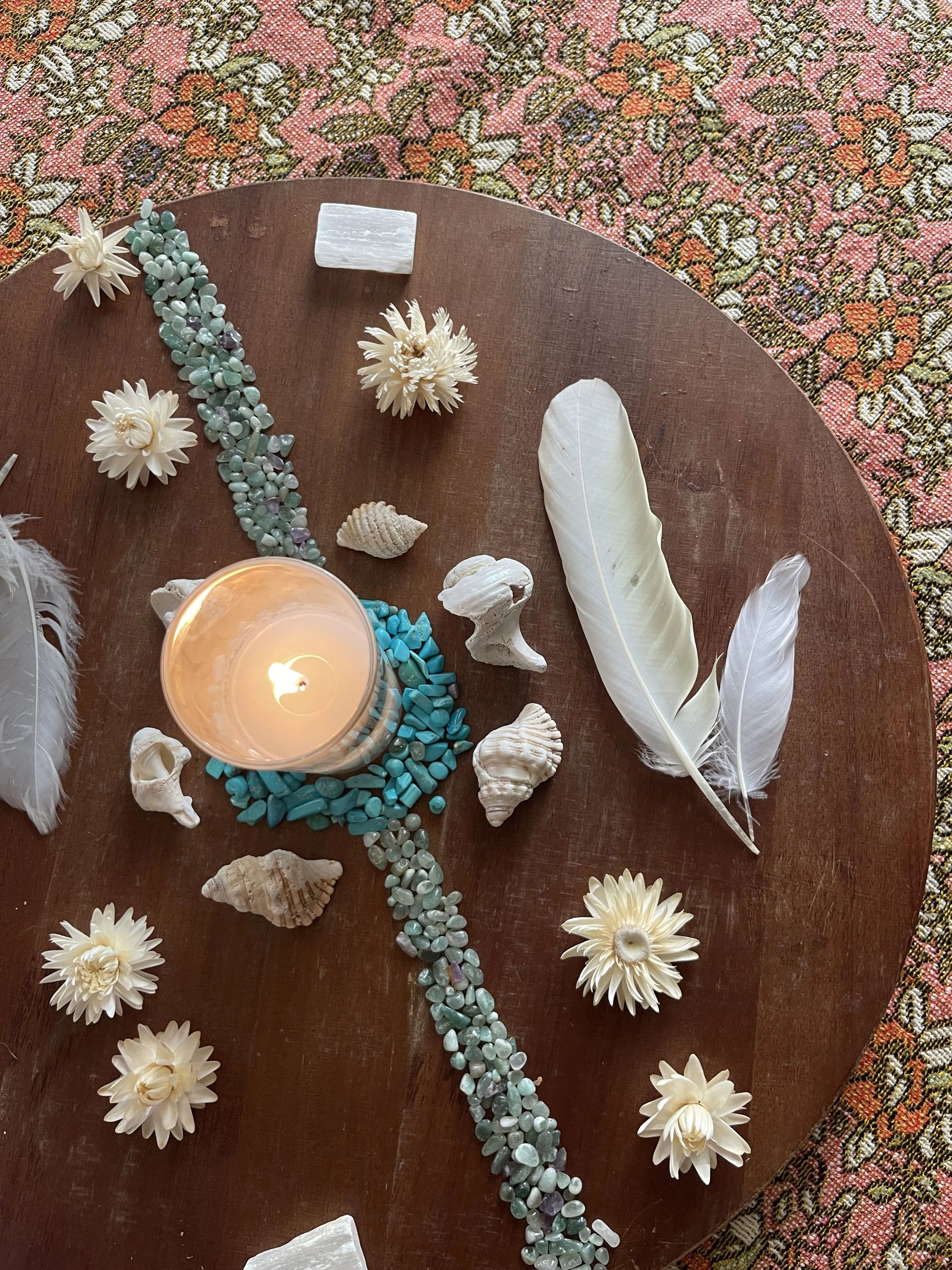 february we gathered for the heart chakra, this looked like writing love letters, adding them into a jar with ingredients & sealing them shut with a wax seal..